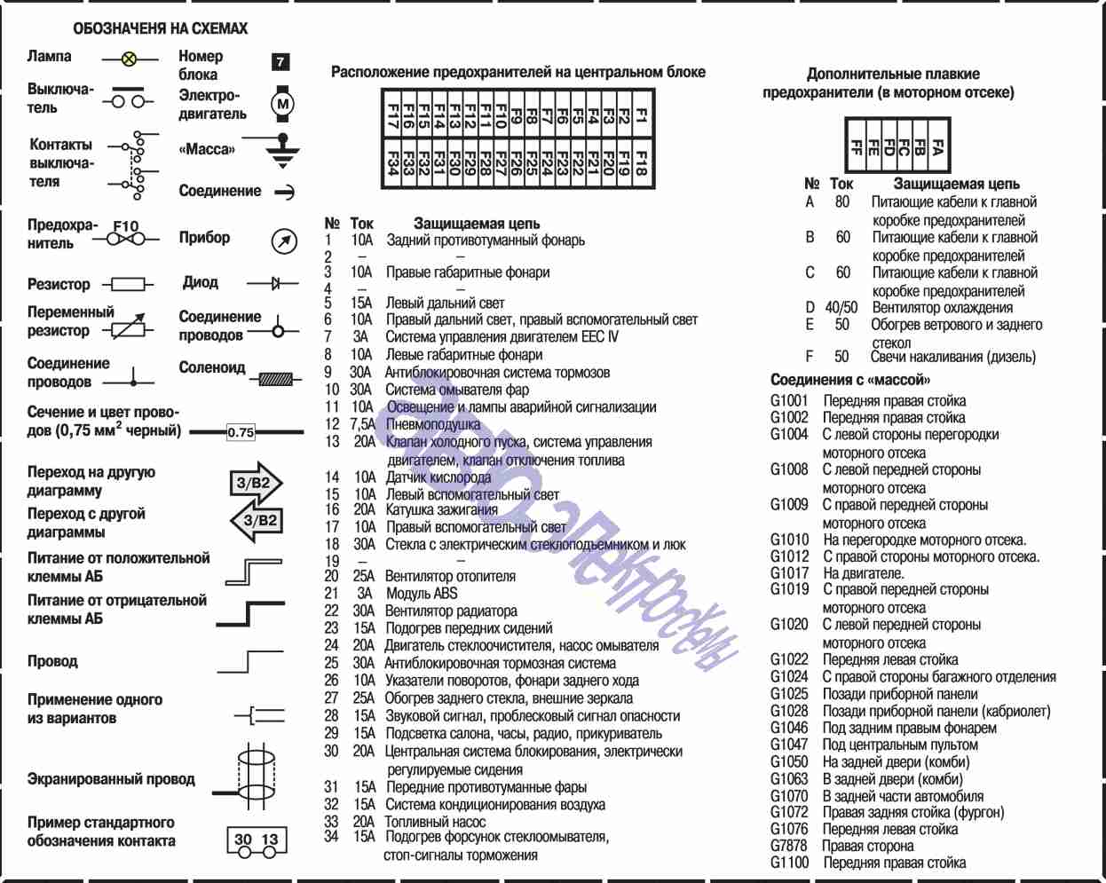На представленных схемах электропроводки автомобиля Форд Эскорт показаны все сопряжённые между собой отдельные участки электроцепи различные по своему функциональному назначению. Это даёт преимущество в поисках неисправностей именно в той цепи которая дала сбой. На электросхемах, в прямоугольных символах расположены цифры указывающие с какой схемой взаимодействует выбранный участок цепи. Электросхема Ford eskort выполнена по стандарту DIN, поэтому токовые контуры в точках соединения пронумерованы. И основными токовыми контурами являются: — задействованная и соединённая с “массой”клема под номером 31. По стандарту DIN практически все “минусовые” провода в электропроводке автомобиля выполнены коричневым цветом. — в соответствии со стандартом все провода находящиеся под “плюсовым” напряжением (даже при выключенном зажигании) обозначаются красным с различными полосами или чисто красным цветом. Клемма под номером 30 принадлежит именно к такому контуру. — клемма 15 принадлежит контуру на который ток поступает только после включения зажигания. Проводка этого контура выполнена чёрным с цветными полосами или чисто чёрным цветом. Цифрами обозначенные плавкие вставки соответсвуют номерам предохранителей и реле. Неразрывные (неразъёмные) соединения нумеруются цифрами с буквенным индексом “S”. Соединения разъединяющиеся (разъёмные) так-же цыфровые, но с индексом “С”. В точках соприкосновения токоведущих элементов с “массой”, соответственно на схеме стоит обозначение буквой “G”.