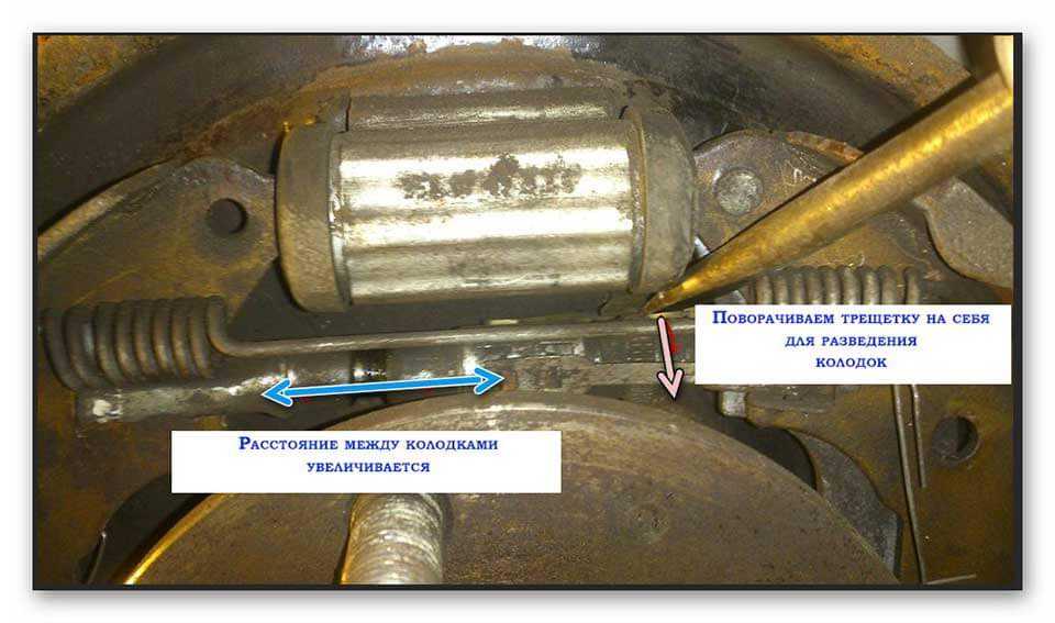 Если храповой механизм сработает мы услышим несколько щелчков , значит зазоры были выше нормы и теперь колодки установились в нормальное положение.