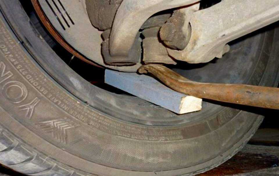 Основная идея данного способа заключается в том, чтобы вытолкнуть шаровую из кулака за счет силы пружин подвески, не применяя съемников. При среднем положении подвески между кулаком и рычагом есть некоторое расстояние. Когда она работает вниз, это расстояние уменьшается. Если в этот зазор установить упор или любой ограничитель хода, то усилие пружины, при просадке автомобиля вниз, будет направлено на выдавливание шаровой из кулака.
