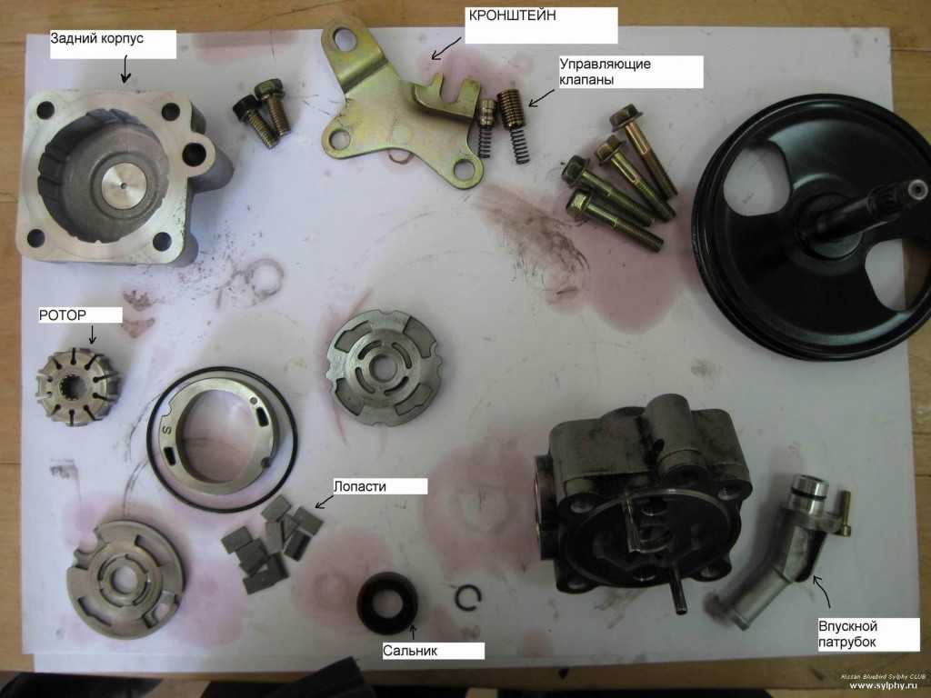 Основной агрегат конструкции гидроусилителя руля — насос. Он обеспечивает перекачку жидкости из бачка в трубопроводы и ее дальнейшее движение под большим давлением по кольцу. Тип применяемых механизмов — шиберные или пластинчатые агрегаты. Они имеют достаточный уровень КПД и небольшой износ рабочих поверхностей. В то же время у них есть слабое звено, возможен выход из строя подшипника, из-за чего нужен ремонт насоса гидроусилителя. Рабочее давление в насосах этого типа, предназначенных для системы ГУР, высокое, по максимуму в пределах 150 бар. В движение такой агрегат приводится ремнем, который крутит одновременно генератор и помпу. Зазоры, которые установлены на заводе при сборке, должны сохраняться в промежутке 0,005—0,01 мм. Если зазор будет увеличиваться и станет превышать допустимый на 0,01 мм, тогда возможно падение давления в системе на малых оборотах, это ощущается на руле, как увеличение нагрузки или языком профессионалов — «тугой» руль.