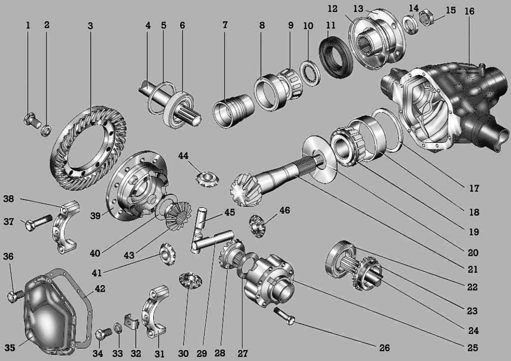 1 — болт; 2, 33 — пружинные шайбы; 3 — ведомая шестерня; 4, 24 — полуоси; 5 — регулировочное кольцо; 6, 22 — подшипники; 7 — распорная втулка; 8 — наружная обойма наружного роликового подшипника; 9 — роликовый подшипник; 10 — упорное кольцо;11 — сальник; 12 — отражатель; 13- фланец; 14 — шайба; 15 — гайка;16 — картер моста; 17 — регулировочное кольцо ведущей шестерни; 18 — наружная обойма внутреннего роликового подшипника; 19 — внутренний роликовый подшипник; 20 — маслоотражательное кольцо; 21 — вал с ведущей шестерней; 23 — регулировочная гайка подшипников дифференциала; 25, 39 — правая и левая части корпуса дифференциала; 26 — болт; 27, 40- опорные шайбы шестерней полуоси; 28, 43 — шестерни полуоси; 29, 45 — оси сателлитов дифференциала; 30, 41, 44, 46 — сателлиты дифференциала; 31, 38 — крышки подшипников дифференциала; 32 — фиксатор регулировочной гайки подшипников дифференциала; 34, 36, 37 — болты; 35 — крышка картера главной передачи; 42 — прокладка крышки картера главной передачи