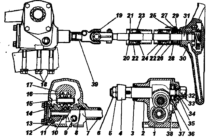Рис. 214. Рулевой Механизм автомобилей семейства УАЗ-31512: 1-картер; 2,39-втулки; 3-манжета; 4-сошка; 5-шайба; 6,33-гайки; 7-сальник; 8,14-подшипники; 9-пробка; 10-вал рулевого механизма; 11-червяк; 12-нижняя крышка; 13-регулировочные прокладки; 15-ось ролика; 16-ролик вала сошки; 17-вал сошки; 18-болты крепления картера; 19-шарнир; 20-стопорное кольцо; 21-защитная шайба; 22-пружина; 23-разжимное кольцо; 24-подшипники; 25-провод звукового сигнала; 26-контактная втулка; 27-винт; 28,29-пластмассовые втулки; 30-рулевое колесо; 31-рулевой вал; 32-регулировочный винт; 34-стопорная шайба; 35-штифт; 36-подшипник; 37-боковая крышка картера; 38-прокладка