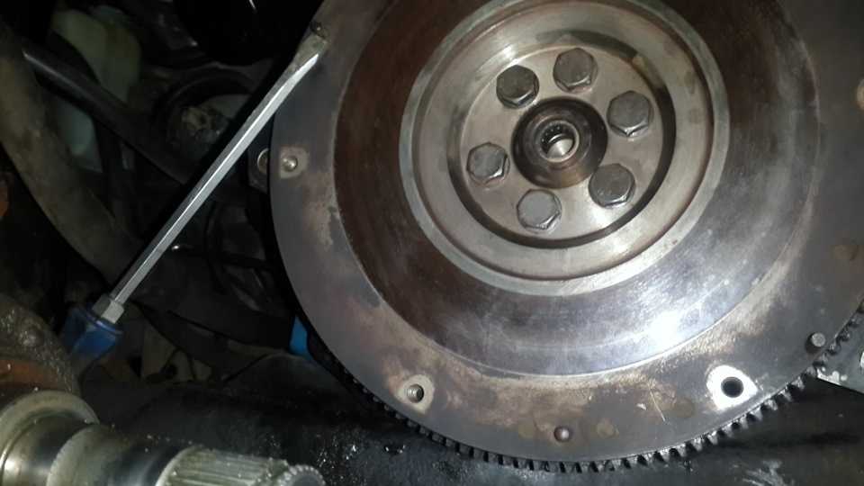 - Отворачивание шести болтов закрепления маховика в двигателе внутреннего сгорания. Их следует отворачивать крест-накрест, что существенно облегчает задачу.