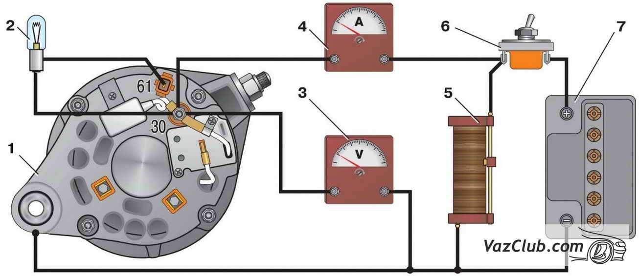 При тестировании реле лампы зарядки категорически запрещается делать КЗ между выходными элементами цепи, т.к. это вызовет дефекты блока устройств выпрямления тока. Перед тестированием реле регулятора зарядки необходимо убедиться в оптимальной степени натяжки генераторного ремня. К электрической цепи генераторной обмотки возбуждения не следует подключать другие энергетические ресурсы, т.к. падение напряжения на исследуемом реле зарядки ВАЗ 2106 может превысить оптимальные значения.