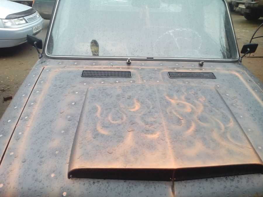 Покраску в виде клепаного патинированного под медь металла сделали исключительно из рекламных целей. Видимо владельцы авто — декоративные металлисты или кузнецы. На капоте установили большой, скорее всего декоративный воздухозаборник, а в салон сварили баранку из толстой цепи, как у хот-родов. Получился довольно симпатичный, но самое главное — очень полезный и функциональный пикап из ВАЗ-2106.