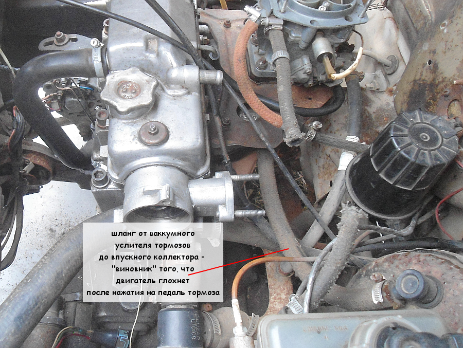 — Если нарушена герметичность вакуумного усилителя тормозов или его шланга в работе двигателя автомобиля начнутся перебои, он затроит на холостом ходу, возможны «провалы» при нажатии на педаль газа и может даже глохнуть при нажатии на педаль тормоза во время движения. Электроды свечи в четвертом цилиндре могут побелеть и избавится от нагара. И все из-за того, что под карбюратор, при таком раскладе, начнет поступать лишний воздух и обеднять топливную смесь. А на бедной смеси двигатель работать не хочет.
