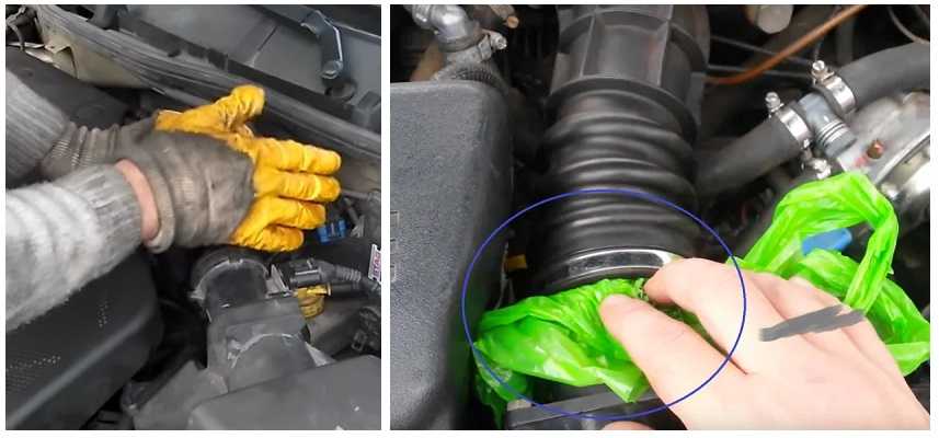 На работающем ДВС рукой или пакетом перекрываем отверстие датчика, автомобиль должен заглохнуть, а впускная гофра сжаться. В двигателе создается вакуум, который при отсутствии подсоса воздуха будет сохраняться продолжительное время и гофра останется сжатой.