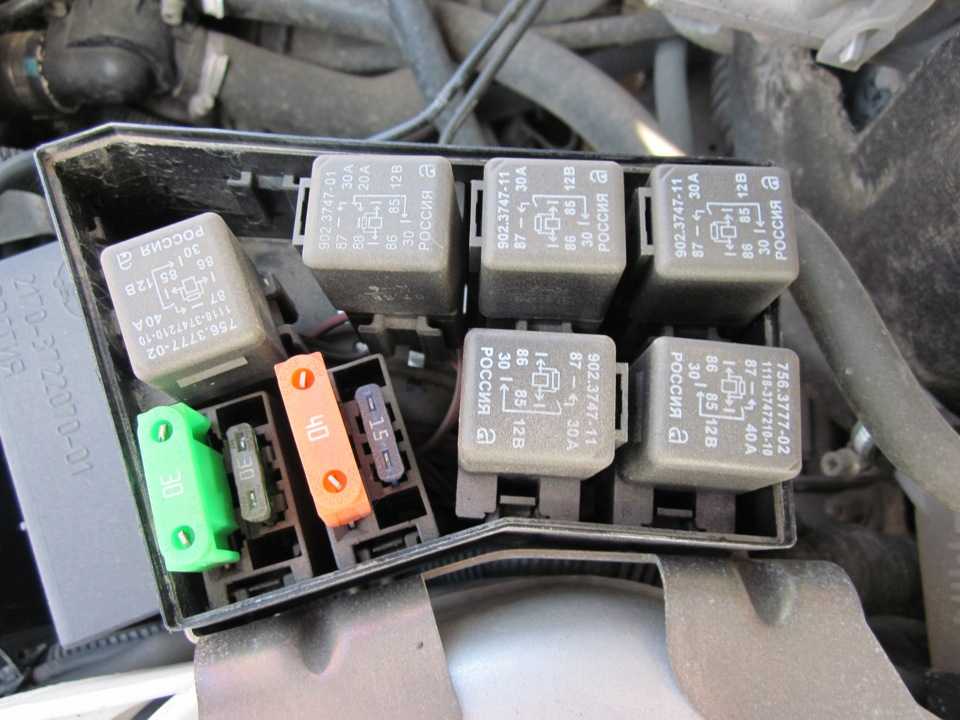 Для замены предохранителей и реле в дополнительном блоке, извлекать его из посадочного места его нет необходимости. Чтобы снять реле, следует открутить ключом на «8» соответствующую гайку его крепления.Перед проведением работ по замене реле, предохранителей или всего блока, настоятельно рекомендуется отключить провод «массы» от аккумулятора, а также отсоединить колодку жгута проводов электронного контроллера двигателя от разъема дополнительного монтажного блока.