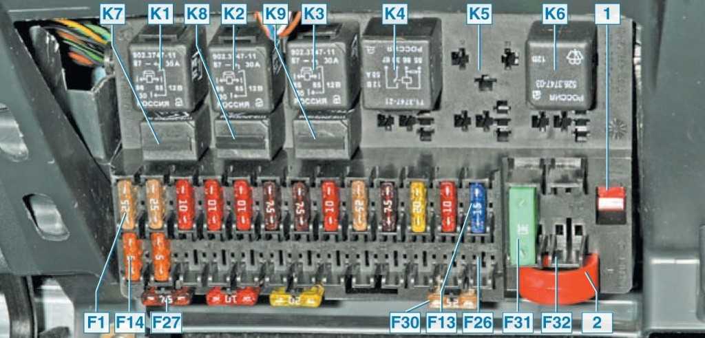 - F31 — 30А — Контроллер электропакета, клемма «2» колодки Х1. Контроллер электропакета, клемма «3» колодки Х1. Модуль управления стеклопакетами на водительской двери, контакт «6». Плафон освещения порога левой передней двери.