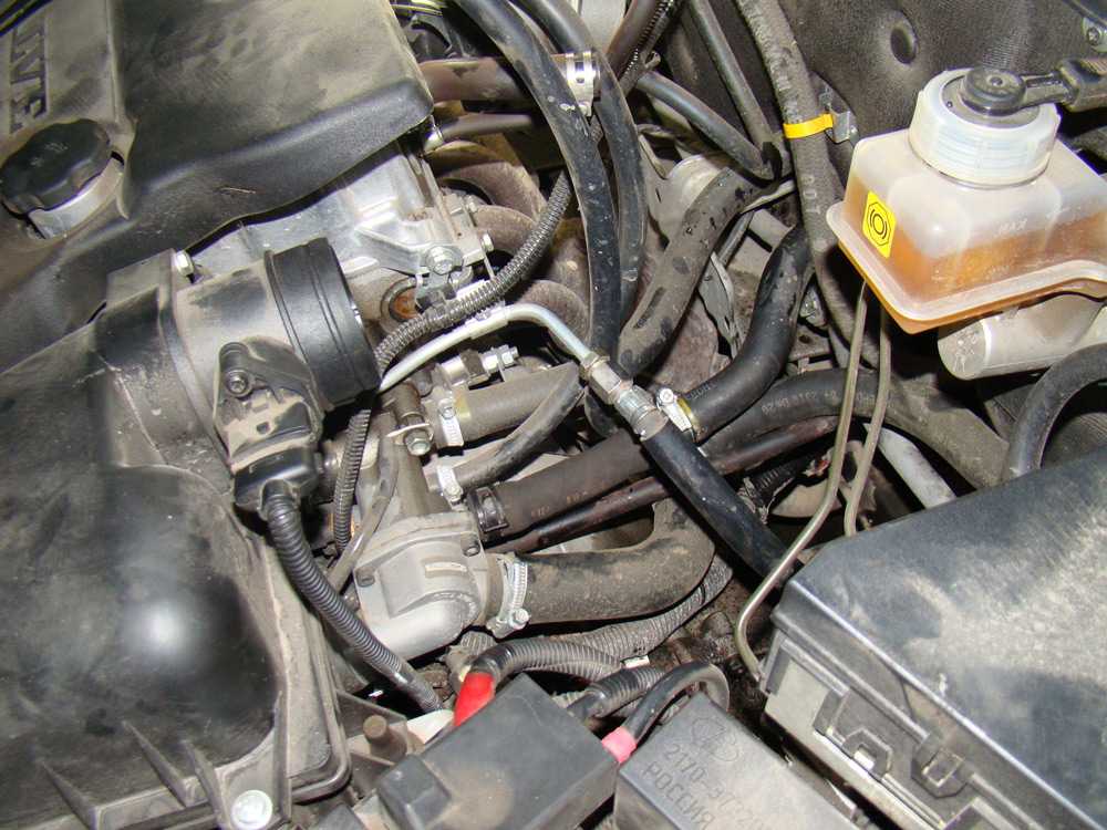 - Нашей следующей задачей является демонтаж дроссельного узла. Без его снятия ресивер не извлечь. Чтобы снять дроссель и избежать вытекания лишнего тосола из патрубков системы охлаждения, нужно предварительно подготовиться (раскрутить крышку расширительного бачка с охлаждающей жидкостью). Для снятия дросселя необходимо отсоединить все присоединенные к нему патрубки, в том числе отвечающие за подачу воздуха (гофру) и охлаждение. Для того чтобы снять сам узел, необходимо ключом или головкой на 13 раскрутить две гайки крепления. Теперь узел вместе с уплотнительной накладкой можно извлечь, а заодно осмотреть и при необходимости почистить.