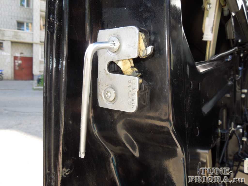 Приора получила в наследие такие же замки на дверях, которые устанавливовались и на двенашках и десятках(что не скажешь о Калине, где продумана система запирания дверей). Из четырех моих дверей без усилия можно было открыть только одну, да и ещё и багажник не хотел оставаться в открытом состояние, пытаясь придавить своего хозяина. Поэтому дождавшись теплых весенних деньков настала пора что-то менять. Забыл рассказать еще про одну вещь, может кто сталкивался. При открывание водительской двери срабатывает центральный замок и все двери самопроизвольно блокируются и если забывшись захлопнул водительскую дверь и оставил ключ в зажигание, придется идти за вторым комплектом. Снять обшивку мне составило большого труда, эту процедуру я выполняю не в первый раз. Еще раз хочу отметить что обшивка дверей не сравнима с прежними моделями ВАЗ все четко и продумано, клипсы не ломаются, все плотничком. Хотя и добавили дегтя автовазовцы, для чего при снятие простой обшивки нобходимо запасатся ключом-звездочкой trox, которым нужно открутить два винта. Что мешало установить винт под крестообразную отверку. Так что друзья запасайтесь набором таких ключей, такой крепеж теперь у приоры повсюду.