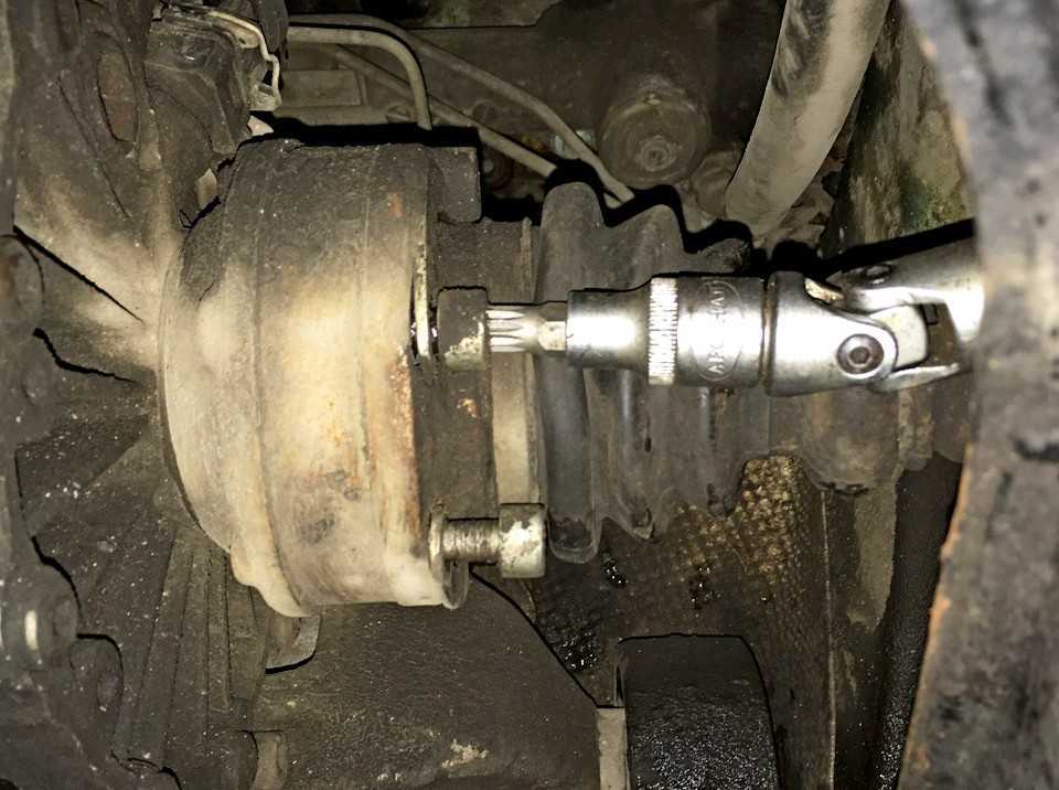 - Ослабляем гайку переднего ступичного подшипника. Применяем шестигранник на 17. Вероятно, придётся использовать рычаг, без усилия гайка не поддастся.