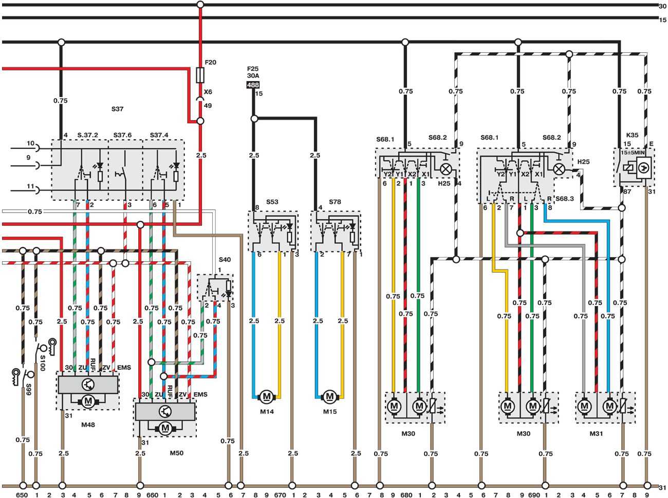 В данном документе представлена схема автомобилей Опель Омега В по фрагментам, для удобства представления. Внизу схемы числовая последовательность указывает линейные координаты элементов схемы, расположенные на этой вертикали.Если линия соединения схемы оканчивается черным прямоугольником, число белого цвета указывает координату, где она продолжается.