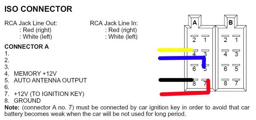 Итак, если проводится замена, то данное несоответствие надо учесть обязательно. Кстати, если установленная ранее автомагнитола страдает проблемой несохранения настроек, то перекинув местами 4 и 7, можно ее решить. Можно вообще решить раз и навсегда проблему с ключом, осуществляя подключение. Например, многим водителям известна ситуация, когда они слушают любимую музыку, автомобиль останавливают, вынимают по привычке ключ из замка и мелодия резко обрывается. Неприятно – не то слово! Проблема данная решается просто, как в остросюжетном кино: перекусывается красный провод, тот, который питание на замок подает. И схема подключения в этом случае выглядит вот так в автомобилях Опель Астра или Омега: