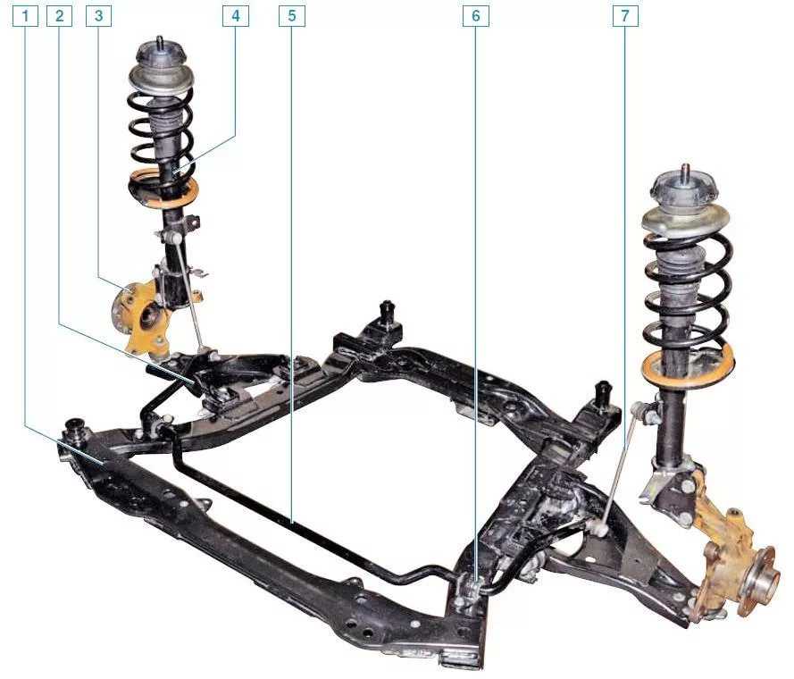 В своей основе данная конструкция заключает в себе подрамник, на котором расположены все жизненно важные функции подвески. Крепление поперечных рычагов к подрамнику производится с помощью сайлент-блоков.