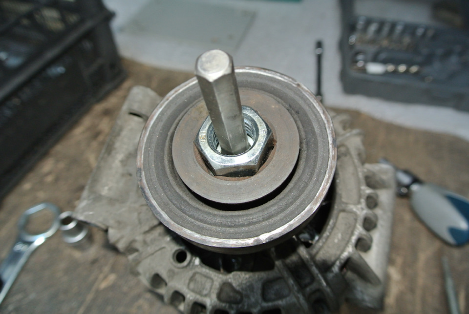 Внутри шкива можно проложить шайбы, так чтобы они заполнили пространство и вставить внутрь биту.