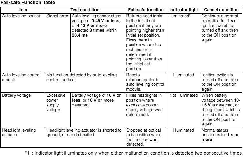 Примечание• Если предупреждающий световой сигнализатор автоматического корректора фар не мигает надлежащим образом, и кроме неисправности блока управления автоматическим корректором фар не удалось обнаружить никаких других неисправностей, замените блок управления автоматическим корректором фар.
