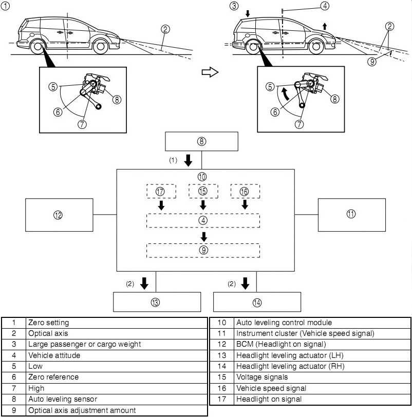 Принцип действияЕсли модуль управления автоматическим выравниванием фар определяет, что автомобиль движется [со скоростью 8 км/ч. или выше в течение четырех секунд] с включенными фарами, рассчитывается среднее значение положения автомобиля, и регулируется оптическая ось.