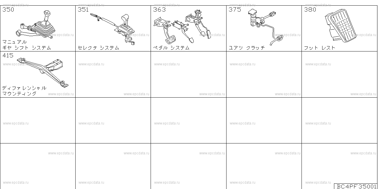 350 — MANUAL GEAR SHIFT SYSTEM351 — SELECTOR SYSTEM363 — PEDAL SYSTEM375 — CLUTCH CONTROL SYSTEM380 — FOOT REST415 — DIFFERENTIAL MOUNTING |