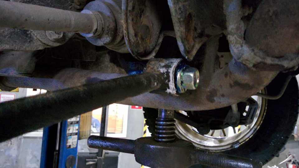 После замены пыльника с отбойником на левой задней стойке хотел сразу сделать сход-развал. Не получилось, т.к. задний болт схождения закис намертво, да ещё и нашёлся люфт левой рулевой тяги.