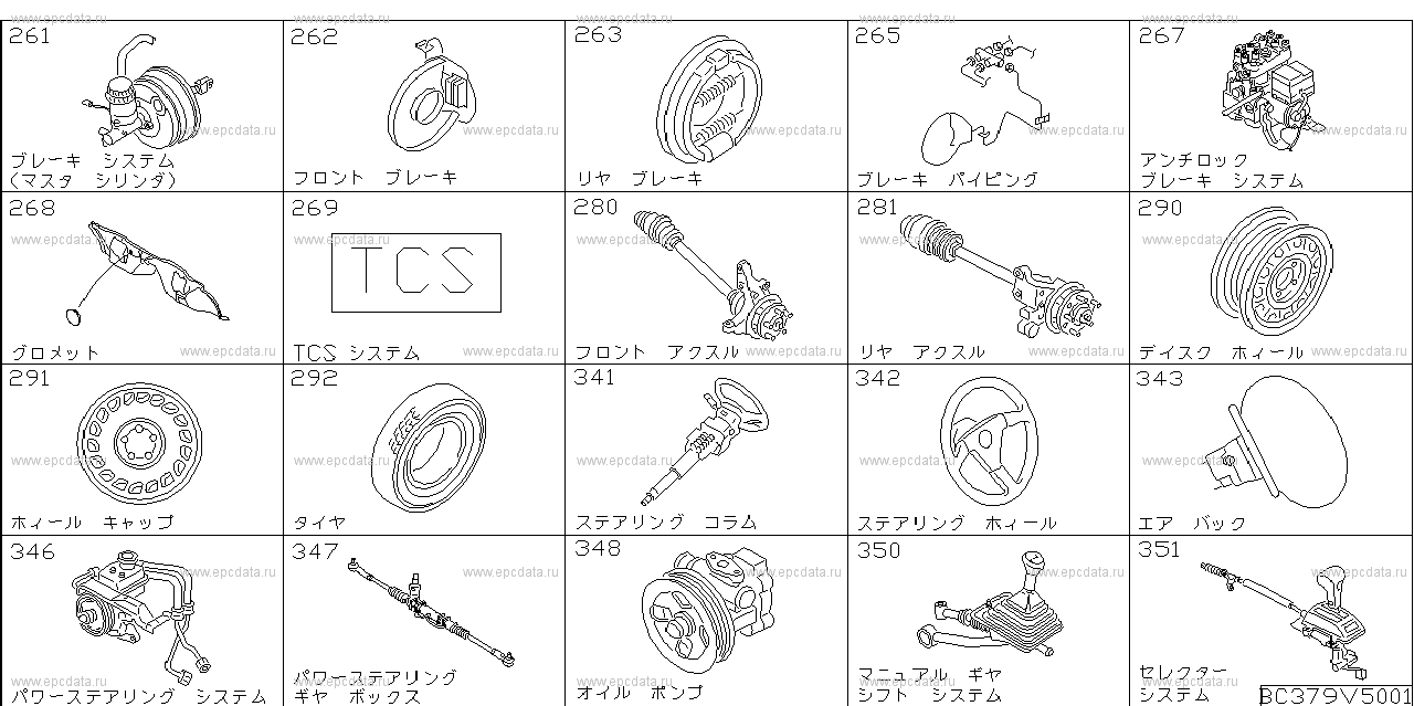 261 — BRAKE SYSTEM (MASTER CYLINDER)262 — FRONT BRAKE263 — REAR BRAKE265 — BRAKE PIPING267 — ANTILOCK BRAKE SYSTEM268 — HILL HOLDER269 — anti slip regulator280 — FRONT AXLE281 — REAR AXLE290 — DISK WHEEL291 — WHEEL CAP292 — TIRE341 — STEERING COLUMN342 — STEERING WHEEL343 — AIR BAG346 — POWER STEERING SYSTEM347 — POWER STEERING GEAR BOX348 — OIL PUMP350 — MANUAL GEAR SHIFT SYSTEM351 — SELECTOR SYSTEM |
