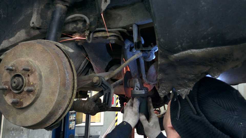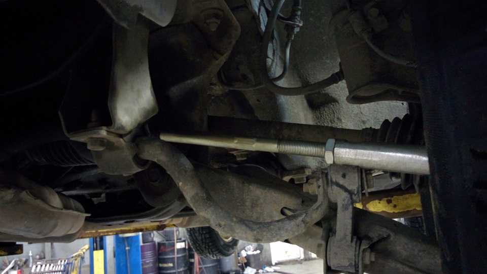 От наконечников были отрезаны части с резьбой, форевскую тягу батя распилил пополам, чуть подрезал концы — чтобы в итоге длина более-менее на оригинальную была похожа. Ну и приварил куски жигулёвских тяг с резьбой к половинкой форестеровской. Соединяем муфтой, получаем возможность регулировки длины тяги в десяток сантиметров, а не в один, который даёт стоковый эксцентриковый болт: