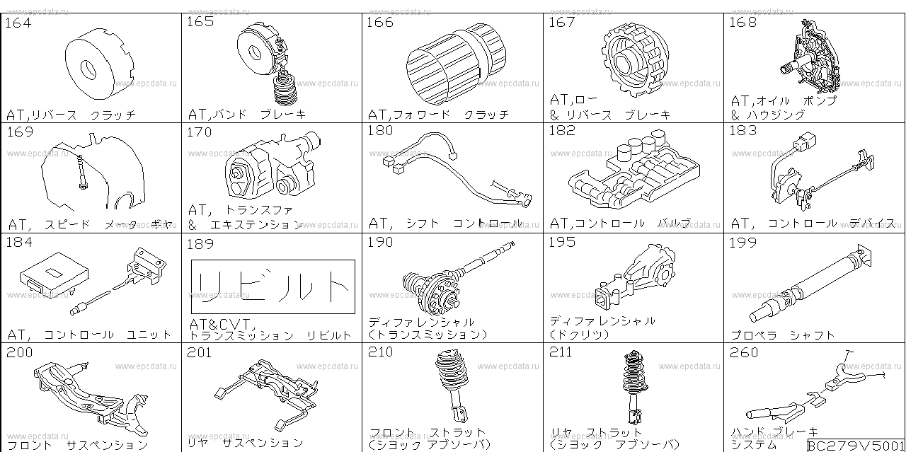 164 — AT, REVERSE CLUTCH165 — AT, BAND BRAKE166 — AT, FOWARD CLUTCH167 — AT, LOW & REVERSE BRAKE168 — AT,OIL PUMP169 — AT, SPEEDOMETER GEAR170 — AT, TRANSFER & EXTENSION180 — AT, SHIFT CONTROL182 — AT, CONTROL VALVE183 — AT, CONTROL DEVICE184 — AT, CONTROL UNIT189 — AT&CVT,transmission rebuilt 190 — DIFFERENTIAL (TRANSMISSION)195 — DIFFERENTIAL (INDIVIDUAL)199 — PROPELLER SHAFT200 — FRONT SUSPENSION201 — REAR SUSPENSION210 — FRONT SHOCK ABSORBER211 — REAR SHOCK ABSORBER260 — PARKING BRAKE SYSTEM |