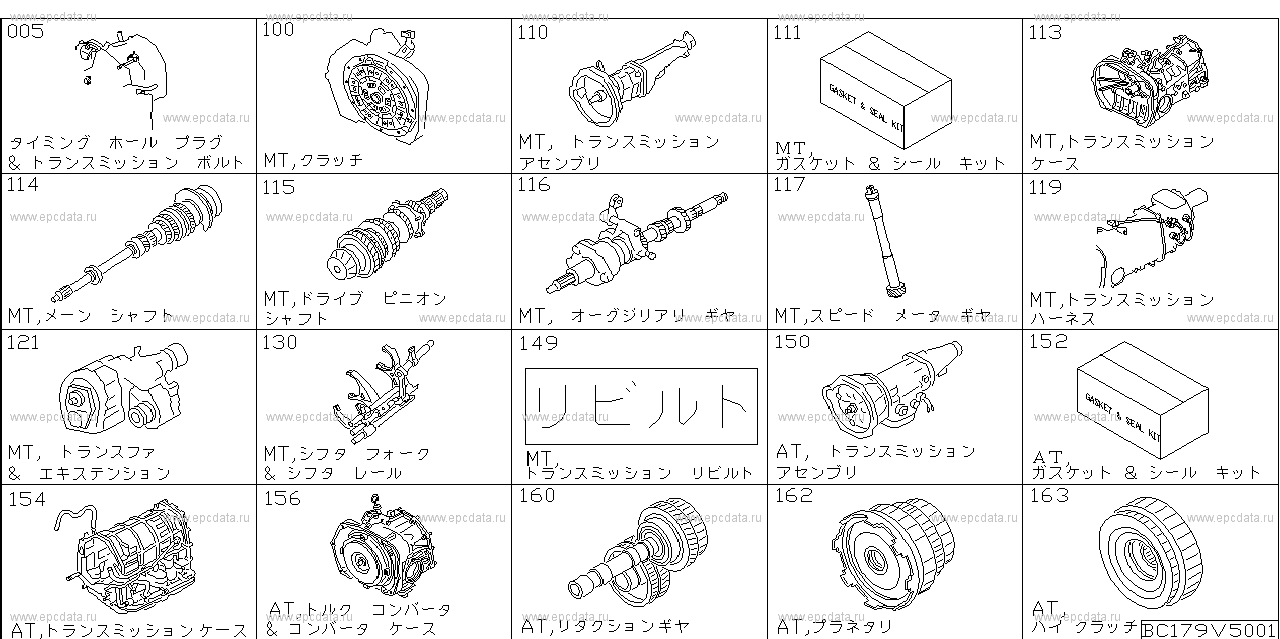 005 — TIMING HOLE PLUG & TRANSMISSION BOLT100 — MT, CLUTCH110 — MT, TRANSMISSION ASSEMBLY111 — MT, GASKET & SEAL KIT113 — MT, TRANSMISSION CASE114 — MT, MAIN SHAFT115 — MT, DRIVE PINION SHAFT116 — MT, AUXILIARY GEAR117 — MT, SPEEDOMETER GEAR119 — MT, TRANSMISSION HARNESS121 — MT, TRANSFER & EXTENSION130 — MT, SHIFTER FORK & SHIFTER RAIL149 — MT,transmission rebuilt 150 — AT, TRANSMISSION ASSEMBLY152 — AT, GASKET & SEAL KIT154 — AT, TRANSMISSION CASE156 — AT, TORQUE CONVERTER & CONVERTER CASE160 — AT, REDUCTION GEAR162 — AT, PLANETARY163 — AT, HIGH CLUTCH |