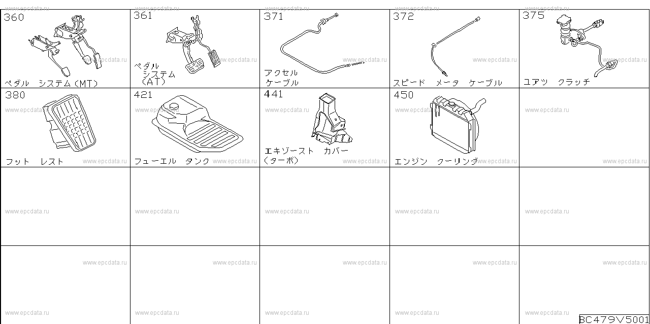 360 — PEDAL SYSTEM (MT)361 — PEDAL SYSTEM (AT)371 — ACCEL CABLE372 — SPEEDOMETER CABLE375 — CLUTCH CONTROL SYSTEM380 — FOOT REST421 — FUEL TANK441 — EXHAUST COVER450 — ENGINE COOLING |