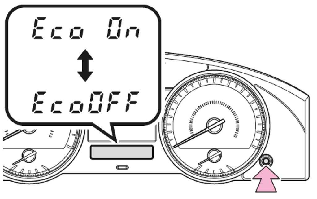 Индикация экологических параметров движения отражается только на версиях Тойоты 200 без многофункционального дисплея. В режиме «одометр» необходимо удерживать обозначенную стрелкой кнопку. Экран сразу перейдёт в режим показаний экологичности движения.