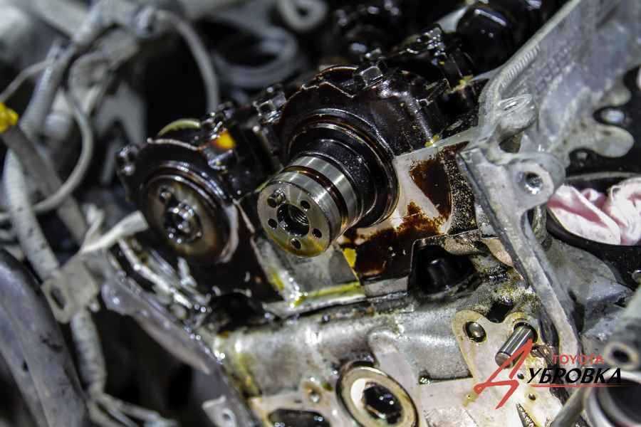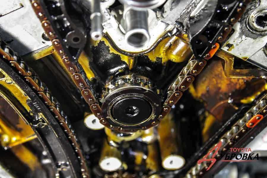 На фотографии крупным планом показаны элементы ГРМ двигателя 1 GR FE. Много масляных отложений. Напомним, что регламент замены масла составляет каждые 10 000 км пробега. Если преобладает городская эксплуатация, для которой характерны частые пробки этот интервал желательно сократить до 8 000 км пробега.