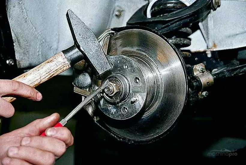 машину домкратом, снять колесо, убрать защитный колпачок. - Производится развальцовка бурта гайки ступицы.