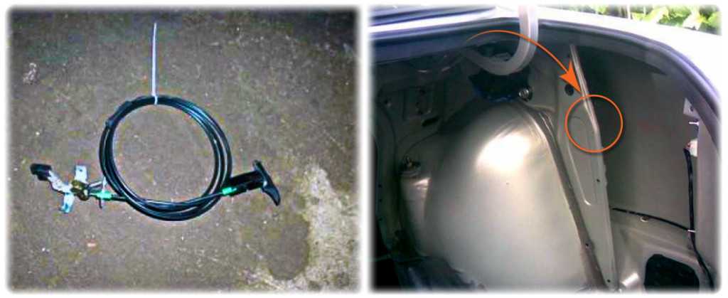 Для этого нужно аккуратно поддеть обшивку и среди проводов нащупать сам тросик. Это делать нужно при снятых накладках порога, но демонтаж сиденья прибавит работы еще на час. Сам механизм запирания лючка крепится просто и на виду, так что с этим проблем не будет.